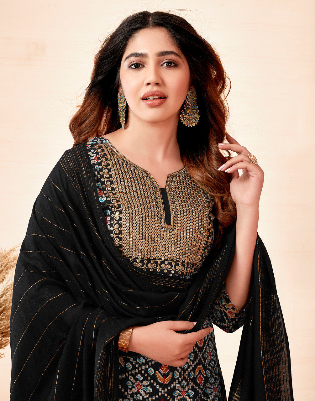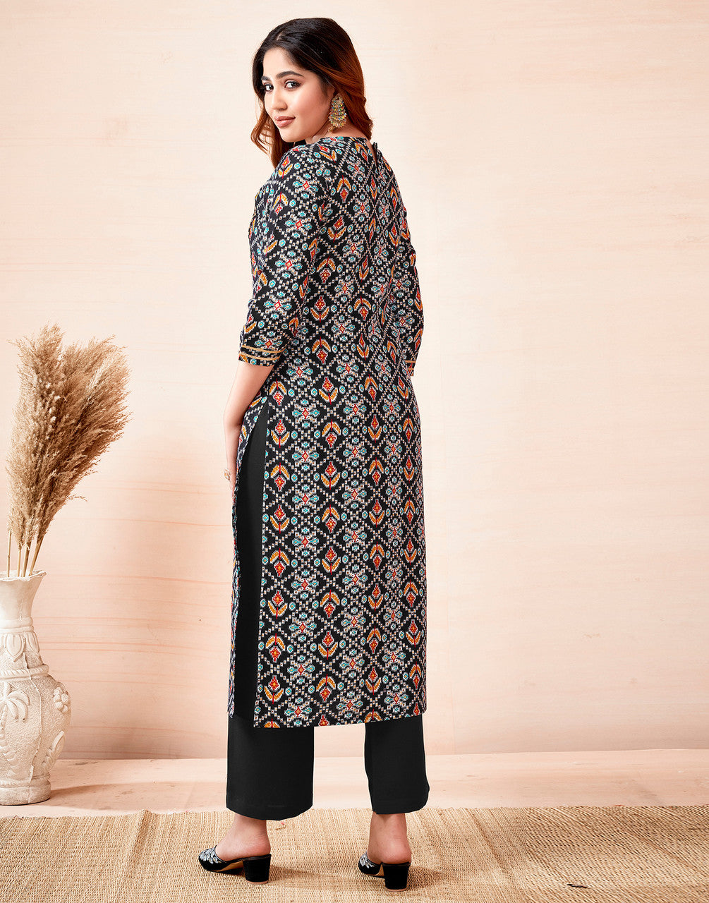 Black Geometric Print Kurta Set with Embroidered Yoke